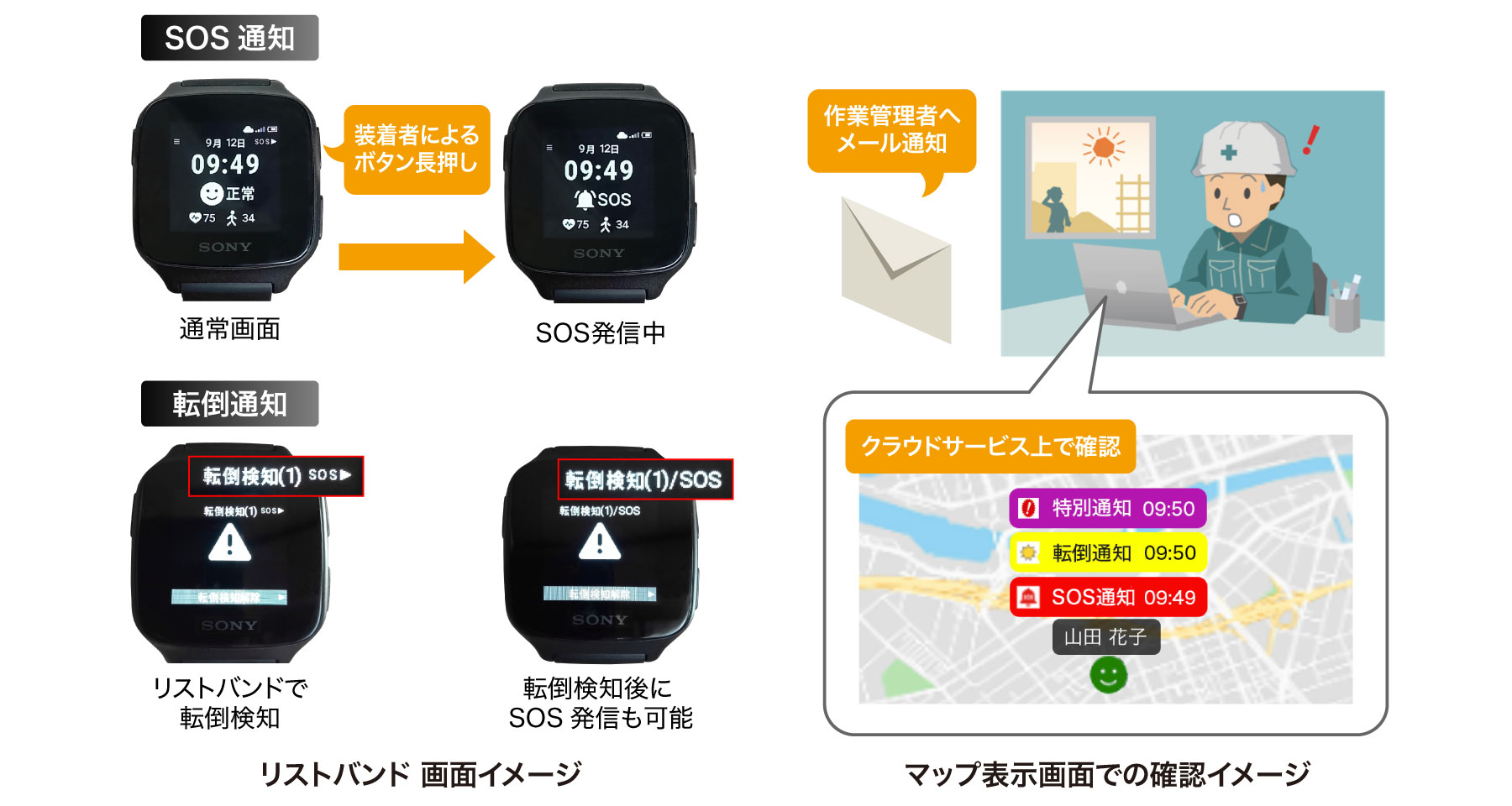 今回の新機能追加により、リストバンド装着者が体調不良などを訴えたいときに、リストバンドのボタンを押すことで作業管理者へのアラート通知を行うことや、リストバンドが装着者の転倒を検知した際に、作業管理者へ自動アラート通知を行うことが可能となりました。作業管理者は専用クラウドサービスにより、装着者の位置情報とあわせてSOS発信や転倒発生の有無および発生時刻を速やかに確認することが可能です。