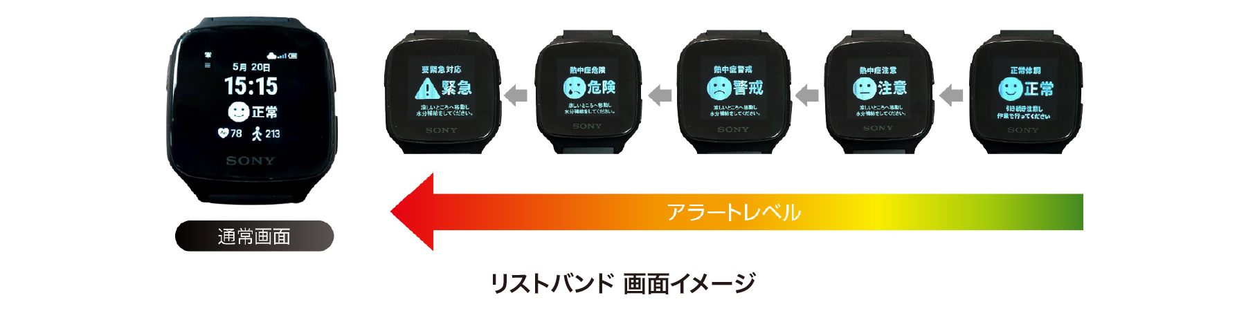 ・リストバンドにより収集された現場作業員の心拍数と位置情報、建設現場内の暑さ指数から、体調管理判定アルゴリズムによる計算を行い作業員の体調を4段階の総合アラートとして表示するとともに、瞬時に作業管理者と作業員本人にアラート通知することで、現場作業員の体調管理をサポートするソリューションです。