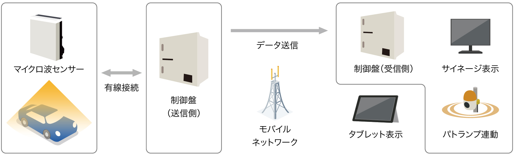 ・マイクロ波センサーに接続したデータ制御盤により、車速データと演算した通過予測時間をLTE回線で送信します。マイクロ波センサーを活用することで、夜間や悪天候でも精度よく車両の検知と速度の計測が可能であるとともに、クラウドを介さず受信側でデータ処理するため、タイムラグ無く情報を表示することが可能です。