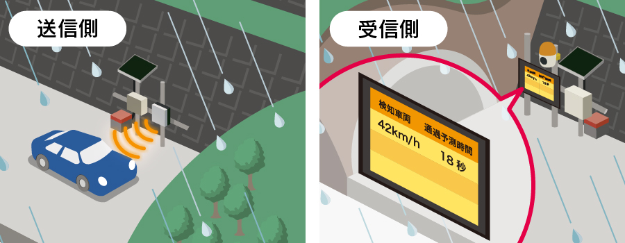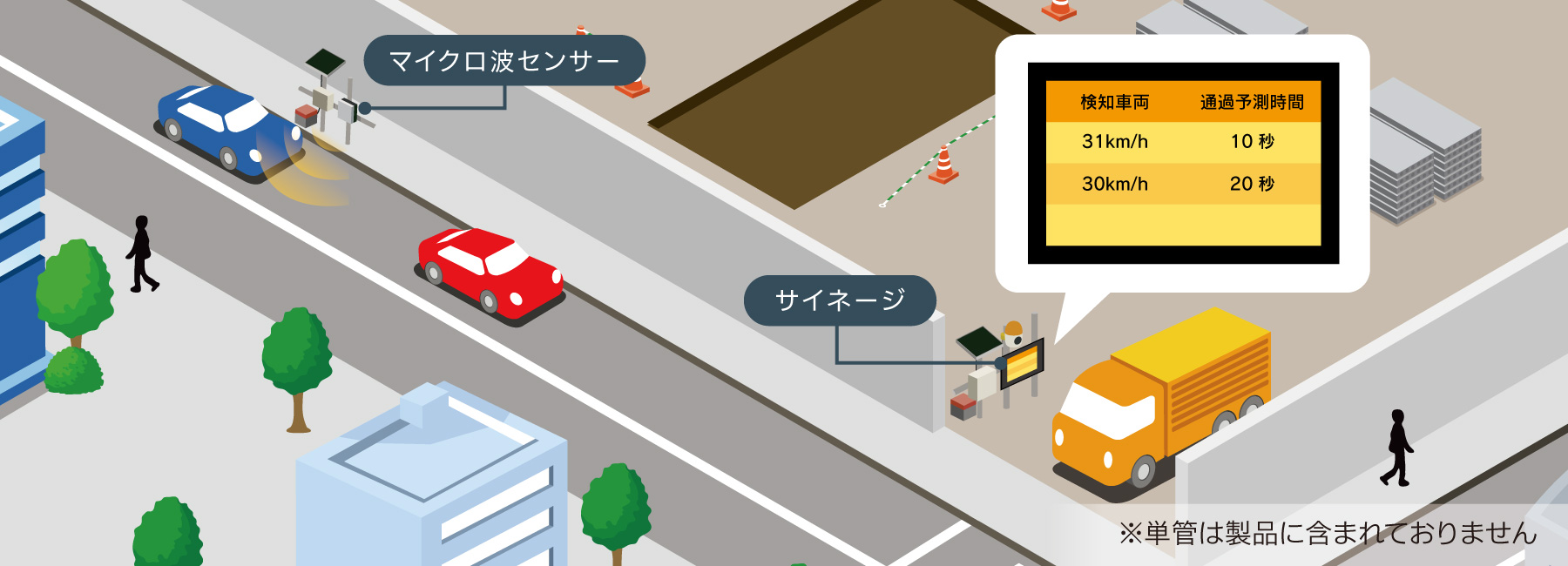 マイクロ波センサーで工事箇所へ接近する車両の検知と速度の計測を行い、通過予測時間をリアルタイムにサイネージやタブレット上に通知します。夜間や悪天候でも高精度に計測でき、タイムラグなく即時に情報を表示することが可能です。