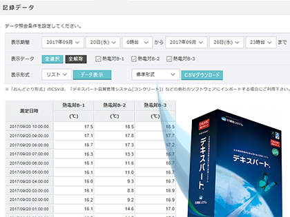 ダウンロードできるファイルにおいて、グラフは画質劣化のないpngファイルまたは圧縮率の高いjpegファイル、リストは汎用的なCSVファイルまたは生データのおんどとり形式から選択できます。また、全データから任意の期間に絞った抽出ができるので、ダウンロードの手間も掛かりません。